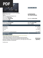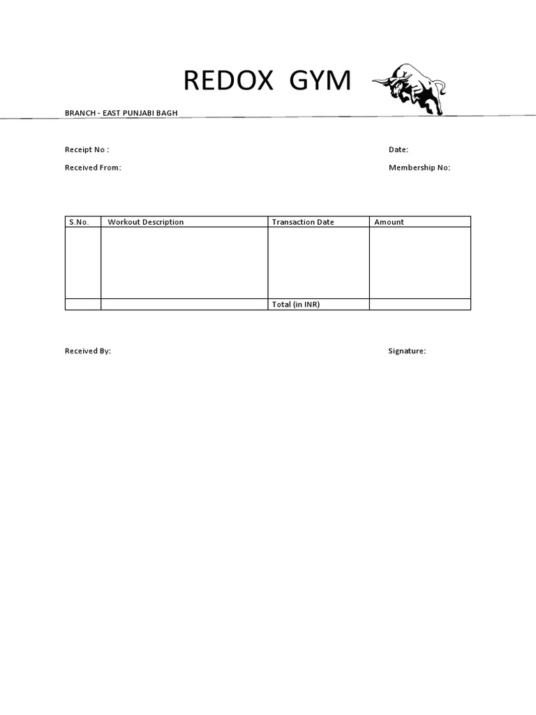 This receipt from Redox Gym in East Punjabi Bagh details a membership transaction. It lists the receipt number, date, member details including name and membership number. It also includes a table with the transaction date and amount paid, along with a total amount in Indian rupees. The receipt is signed by the assistant receiving payment.