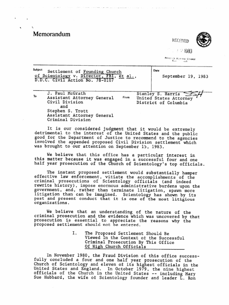 Harris, the US Attorney for Washington DC, explains in 1983 to the US Attorney General's office why Scientology should never get the benefit of the doubt