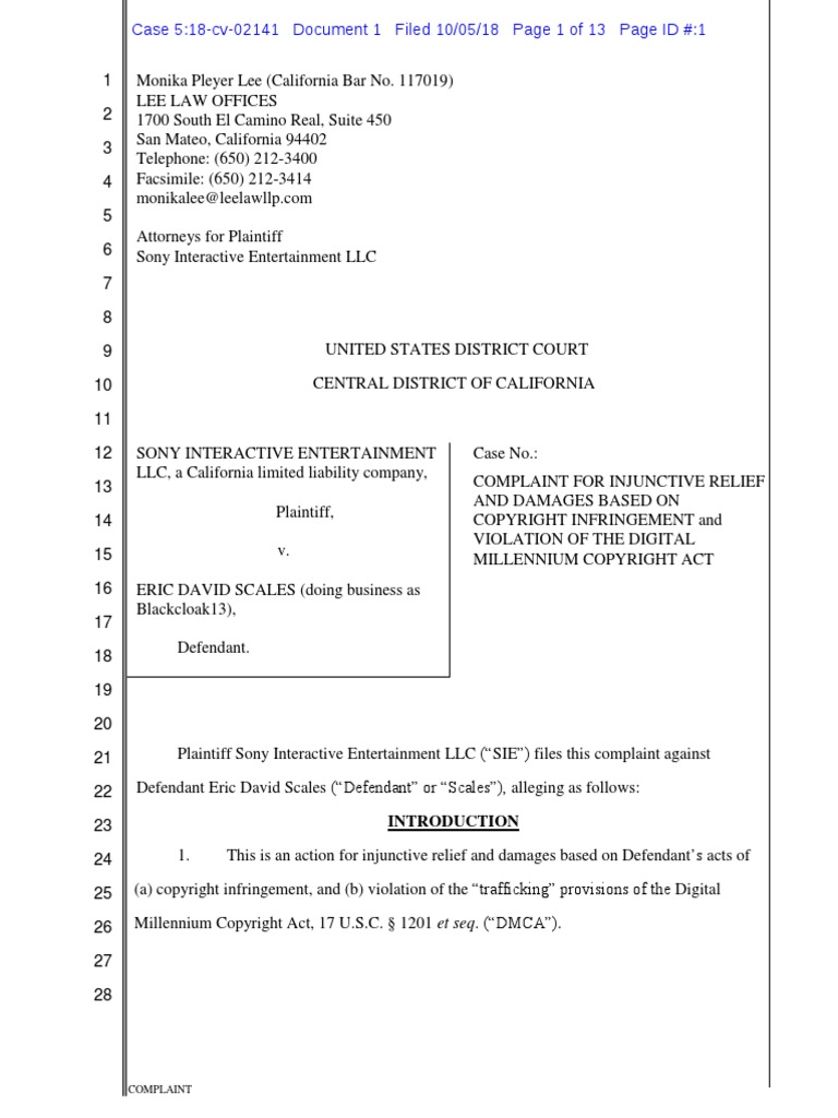 Monika Pleyer Lee (California Bar No. 117019) LEE LAW OFFICES 1700 South El Camino Real, Suite 450 San Mateo, California 94402 Telephone: (650) 212-3400 Facsimile: (650) 212-3414 monikalee@leelawllp.com Attorneys for Plaintiff Sony Interactive Entertainment LLC UNITED STATES DISTRICT COURT CENTRAL DISTRICT OF CALIFORNIA SONY INTERACTIVE ENTERTAINMENT LLC, a California limited liability company, Plaintiff, v. ERIC DAVID SCALES (doing business as Blackcloak13), Defendant.