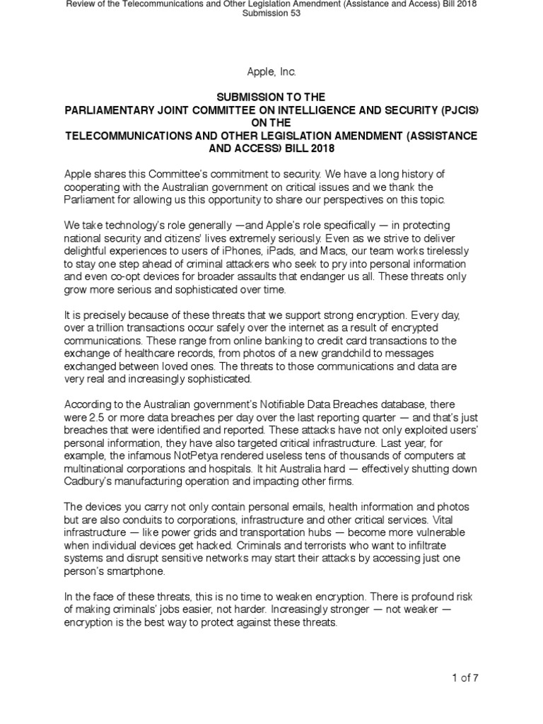Apple shares this Committee’s commitment to security. We have a long history of cooperating with the Australian government on critical issues and we thank the Parliament for allowing us this opportunity to share our perspectives on this topic. We take technology’s role generally —and Apple’s role specifically — in protecting national security and citizens' lives extremely seriously. Even as we strive to deliver delightful experiences to users of iPhones, iPads, and Macs, our team works tirelessly to stay one step ahead of criminal attackers who seek to pry into personal information and even co-opt devices for broader assaults that endanger us all. These threats only grow more serious and sophisticated over time.It is precisely because of these threats that we support strong encryption. Every day, over a trillion transactions occur safely over the internet as a result of encrypted communications. These range from online banking to credit card transactions to the exchange of healthcare records, from photos of a new grandchild to messages exchanged between loved ones. The threats to those communications and data are very real and increasingly sophisticated.According to the Australian government’s Notifiable Data Breaches database, there were 2.5 or more data breaches per day over the last reporting quarter — and that’s just breaches that were identified and reported. These attacks have not only exploited users’ personal information, they have also targeted critical infrastructure. Last year, for example, the infamous NotPetya rendered useless tens of thousands of computers at multinational corporations and hospitals. It hit Australia hard — effectively shutting down Cadbury’s manufacturing operation and impacting other firms. The devices you carry not only contain personal emails, health information and photos but are also conduits to corporations, infrastructure and other critical services. Vital infrastructure — like power grids and transportation hubs — become more vulnerable when individual devices get hacked. Criminals and terrorists who want to infiltrate systems and disrupt sensitive networks may start their attacks by accessing just one person’s smartphone. In the face of these threats, this is no time to weaken encryption. There is profound risk of making criminals’ jobs easier, not harder. Increasingly stronger — not weaker — encryption is the best way to protect against these threats.