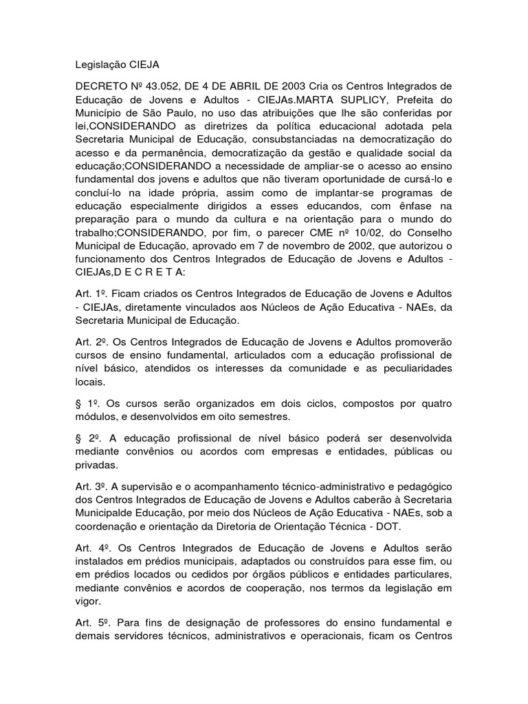 DECRETO Nº 43.052, DE 4 DE ABRIL DE 2003 Cria os Centros Integrados de