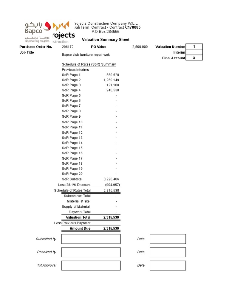SITE DIMENSION/COST SHEET PURCHASE ORDER: 296172 CONTRACTOR: