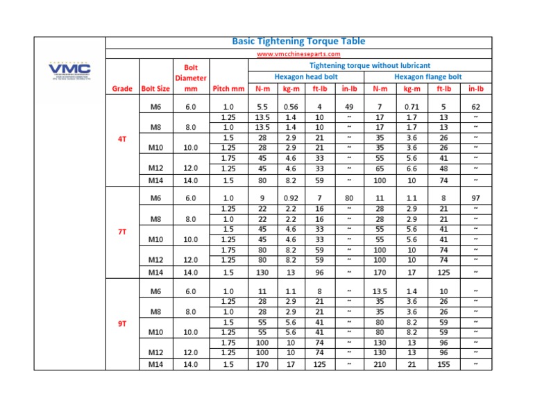 Basic Tightening Torque Table