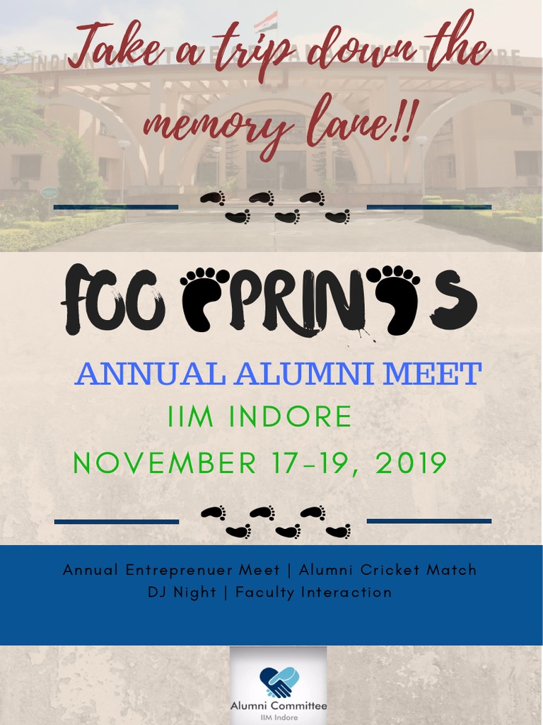 The document announces an annual alumni meet for IIM Indore from November 17-19, 2019, which will include an annual entrepreneur meet, alumni cricket match, and DJ night, as well as faculty interaction.