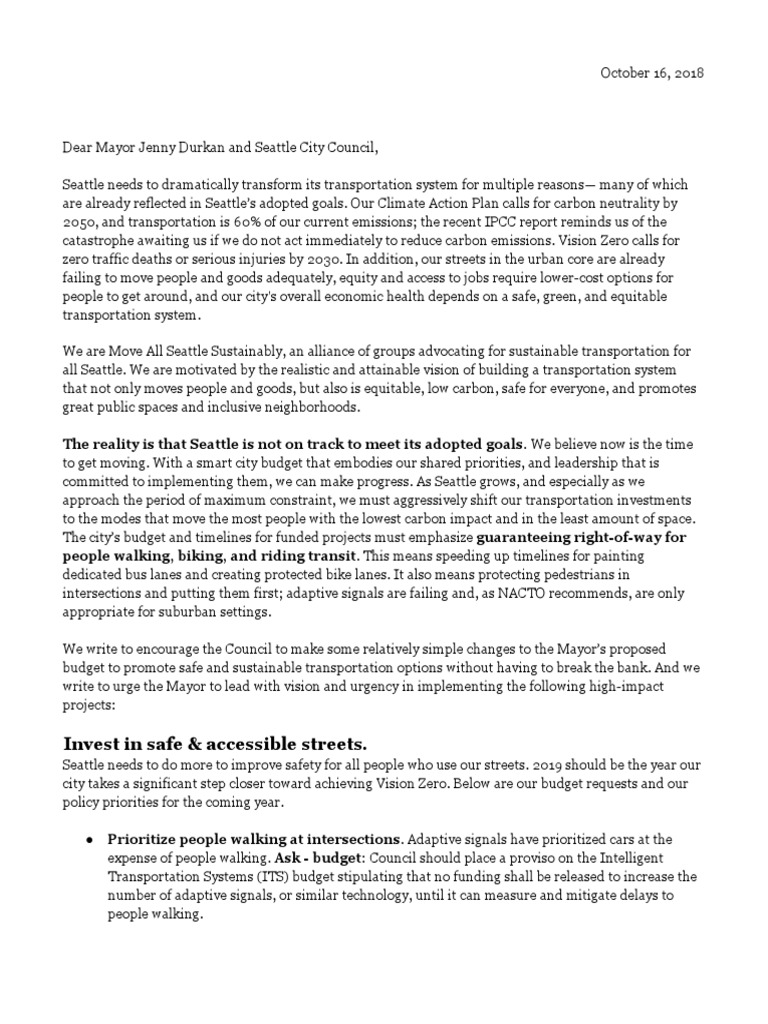 October 16, 2018 Dear Mayor Jenny Durkan and Seattle City Council, Seattle needs to dramatically transform its transportation system for multiple reasons— many of which are already reflected in Seattle’s adopted goals. Our Climate Action Plan calls for carbon neutrality by 2050, and transportation is 60% of our current emissions; the recent IPCC report reminds us of the catastrophe awaiting us if we do not act immediately to reduce carbon emissions. Vision Zero calls for zero traffic deaths or serious injuries by 2030. In addition, our streets in the urban core are already failing to move people and goods adequately, equity and access to jobs require lower-cost options for people to get around, and our city's overall economic health depends on a safe, green, and equitable transportation system. We are Move All Seattle Sustainably, an alliance of groups advocating for sustainable transportation for all Seattle. We are motivated by the realistic and attainable vision of building a transportation system that not only moves people and goods, but also is equitable, low carbon, safe for everyone, and promotes great public spaces and inclusive neighborhoods.