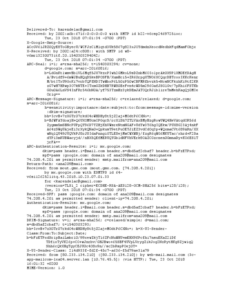 Delivered-To: karendelac@gmail.com Received: by 2002:a6b:6716:0:0:0:0:0 with SMTP id b22-v6csp2469725ioc; Tue, 23 Oct 2018 07:01:34 -0700 (PDT) X-Google-Smtp-Source: ACcGV61JRZ0QyE8ToGByecU/WCFJzC1M1qtd3Uk5867g823xJOYdmdnXeocdNedhkFqdMamFOhjx X-Received: by 2002:a24:c808:: with SMTP id w8-v6mr13230073itf.20.1540303294042; Tue, 23 Oct 2018 07:01:34 -0700 (PDT) ARC-Seal: i=1; a=rsa-sha256; t=1540303294; cv=none; d=google.com; s=arc-20160816; b=LdGnKt1wmvBb1VL6Mqf5JX7kzxPIwh2GMkoL9sDZnbM6OIolprAk0X9PlXM0EfDAgH A/Bvidf9+6mWJBuHQqD5keBPOSFB/XumHci5+ZR60rpgXTNO6XCQqcDBTcoxIKKcKenr M/btITxU9GoKi7vrbYQFfNDITwWbxP6L50zP50wCBFMRfbvzk5+NcsNCFkzhKi9tf2KR zG7wH7HRwp3O7kNTE+ITxmGZkDHB7RW80EeFvn4cWD5m296OafJSGlGv/7pKhi6FSTKb G0u0A6LnVS4InFRr546bN0A/yf753TzmHz3ykDEmJATOQrRJiblireTmMehKagQj0MIe Orig== ARC-Message-Signature: i=1; a=rsa-sha256; c=relaxed/relaxed; d=google.com; s=arc-20160816; h=sensitivity:importance:date:subject:to:from:message-id:mime-version :dkim-signature; bh=IcvB+7zXGTr07rkdO4oWHDHy8t5jZ2aj+MOdtP6CXNo=; b=BJWFAYdoajH+Q6UXOMUcmIPGqcS/rcXlDh7ZTLVAxBMyHzgRowUWQ4HeVAtqdOR56d Zygmm5mSBNcPUPpQY96D7YZHjKhVWsreNtmNGAF+UdYw3Y6hgIQEkw/PUX8G23Aj4nkF A64zSWgUAjeEi3rXykQNa0+QpkusY9etPuOEYJ1EZ3vdCdOq3p+WQxmaCVt689ARn/XX wNqlQU49JUQVkPJ8rJ8IdaPnngiGTLE8ejMwCWXWBj/fzgR6qWG6MKUTac/xhrd+F2Sa dYP13mKUBWacyjd//nBX5QEfMERUQYGb1dNFVhVErk8OAZCGzcnen0GmnaDy+KO6ESlT jrFA== ARC-Authentication-Results: i=1; mx.google.com; dkim=pass header.i=@mail.com header.s=dbd5af2cbaf7 header.b=bFzETPxd; spf=pass (google.com: domain of ana209@mail.com designates 74.208.4.201 as permitted sender) smtp.mailfrom=ana209@mail.com Return-Path: <ana209@mail.com> Received: from mout.gmx.com (mout.gmx.com. [74.208.4.201]) by mx.google.com with ESMTPS id 64-v6si1262521itq.43.2018.10.23.07.01.33 for <karendelac@gmail.com> (version=TLS1_2 cipher=ECDHE-RSA-AES128-GCM-SHA256 bits=128/128); Tue, 23 Oct 2018 07:01:34 -0700 (PDT) Received-SPF: pass (google.com: domain of ana209@mail.com designates 74.208.4.201 as permitted sender) client-ip=74.208.4.201; Authentication-Results: mx.google.com; dkim=pass header.i=@mail.com header.s=dbd5af2cbaf7 header.b=bFzETPxd; spf=pass (google.com: domain of ana209@mail.com designates 74.208.4.201 as permitted sender) smtp.mailfrom=ana209@mail.com DKIM-Signature: v=1; a=rsa-sha256; c=relaxed/simple; d=mail.com; s=dbd5af2cbaf7; t=1540303293; bh=IcvB+7zXGTr07rkdO4oWHDHy8t5jZ2aj+MOdtP6CXNo=; h=X-UI-Sender-Class:From:To:Subject:Date; b=bFzETPxdSripBaiLmbr10/99xewZkjT16ZFcNuWHU+mEHX9fPcfhi7nsuEKaZ2lDf TDfixTyVK26p+CO+wJnrbv/GHJBwo+65SBF4UVpLVrygZikJog2NzRytHKgSZjwiqQ Shh6cQkXHgTgyCEJU0c4O8o9n//sc2bRspPOej0Y= X-UI-Sender-Class: 214d933f-fd2f-45c7-a636-f5d79ae31a79 Received: from [80.233.134.210] ([80.233.134.210]) by web-mail.mail.com (3c-app-mailcom-lxa04.server.lan [10.76.45.5]) (via HTTP); Tue, 23 Oct 2018 16:01:32 +0200 MIME-Version: 1.0
