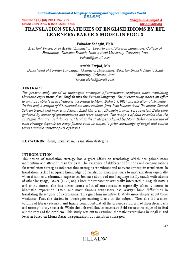 Shojaei, A. (2012). Translation of Idioms and Fixed Expressions: Strategies and Difficulties.