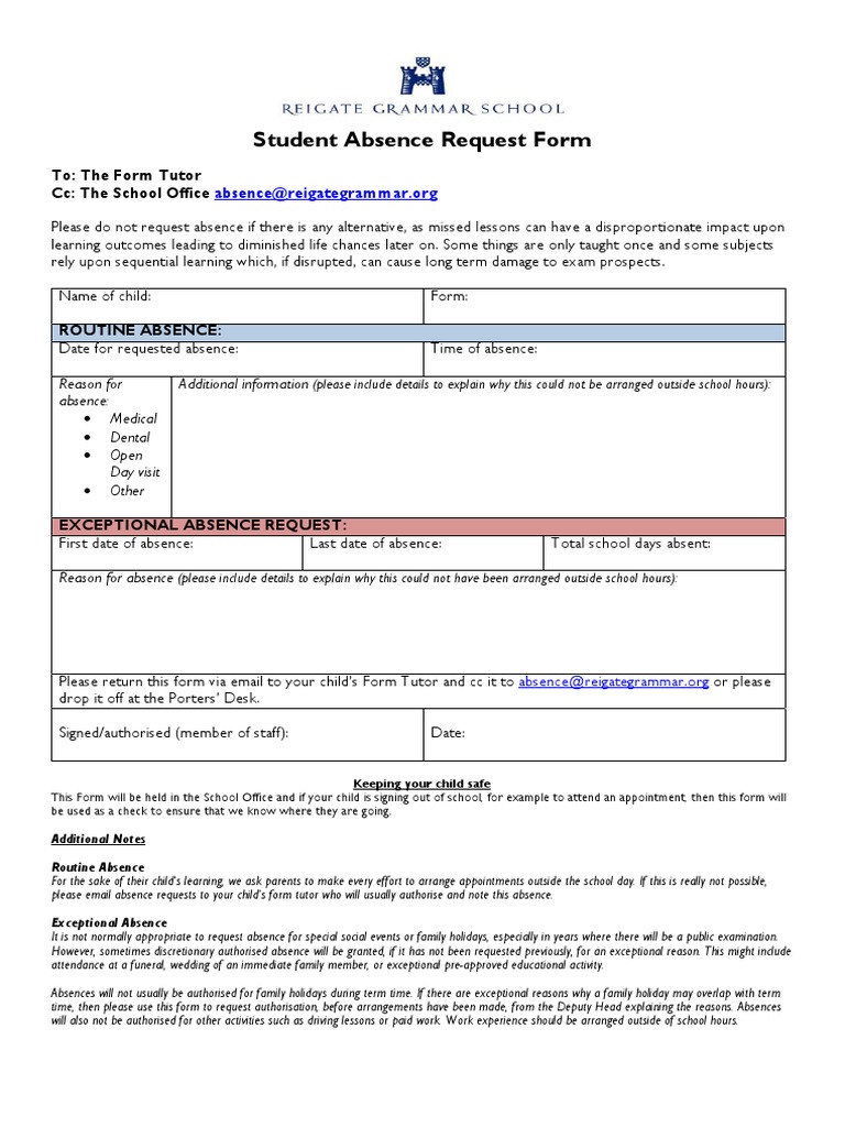 please email absence requests to your child’s form tutor who will usually authorise and note this absence.