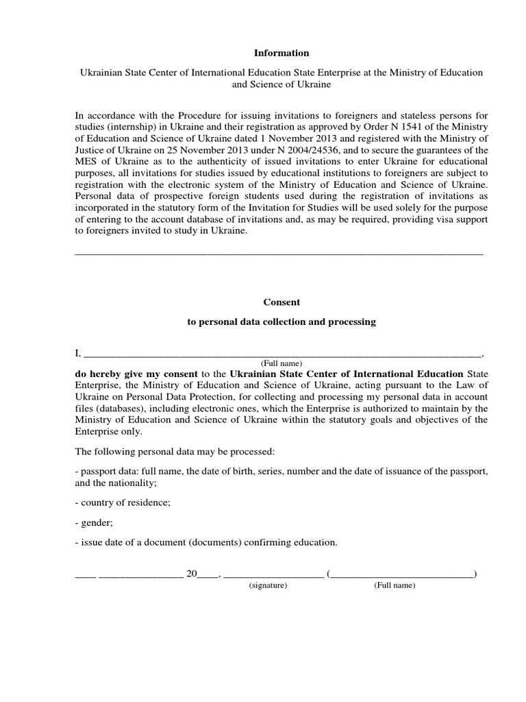 do hereby give my consent to the Ukrainian State Center of International Education State