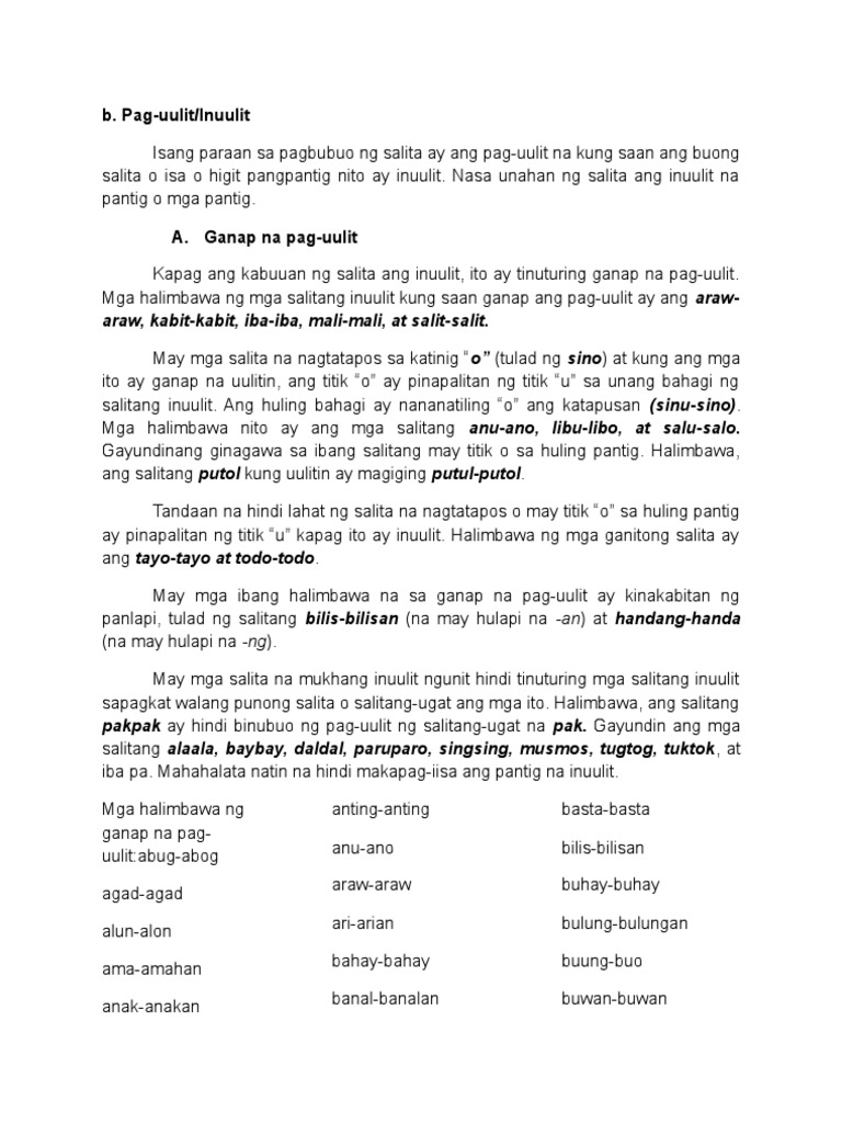 B.1 Pag-uulit ng unang pantig. May mga salita na binubuo ng pag-uulit ng unang