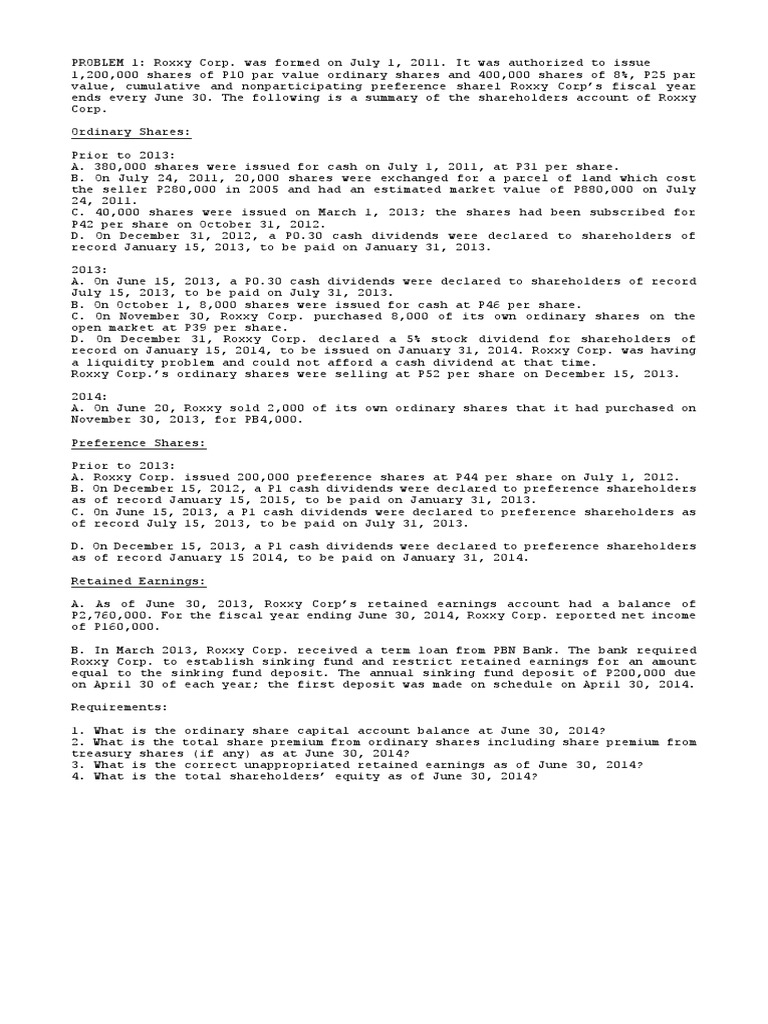 A. Roxxy Corp. issued 200,000 preference shares at P44 per share on July 1, 2012.