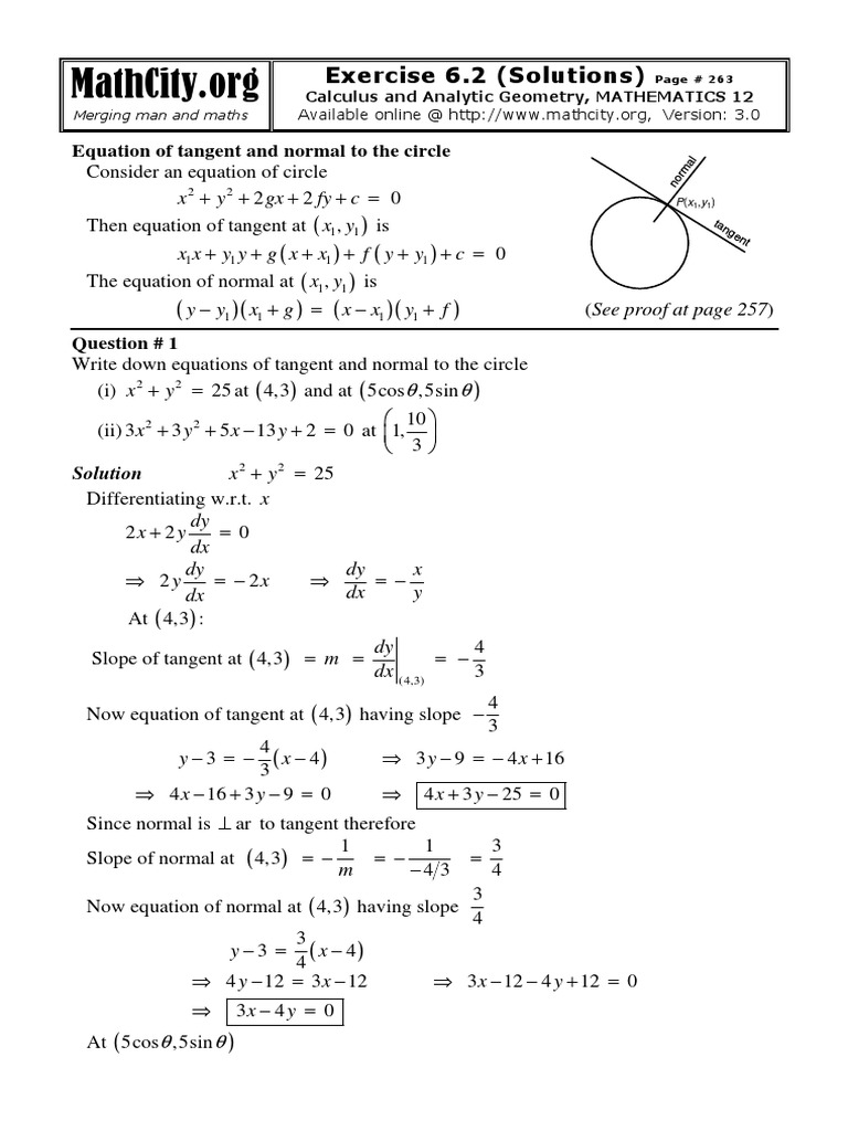 Write down equations of tangent and normal to the circle
