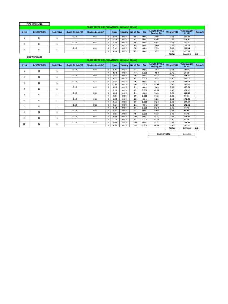 SI NO DESCRIPTION No OF Slab Depth Of Slab (D) Effective Depth (d) Span Spacing No of Bar Dia Length OF the Weight/Mt Total Weight Reamrk