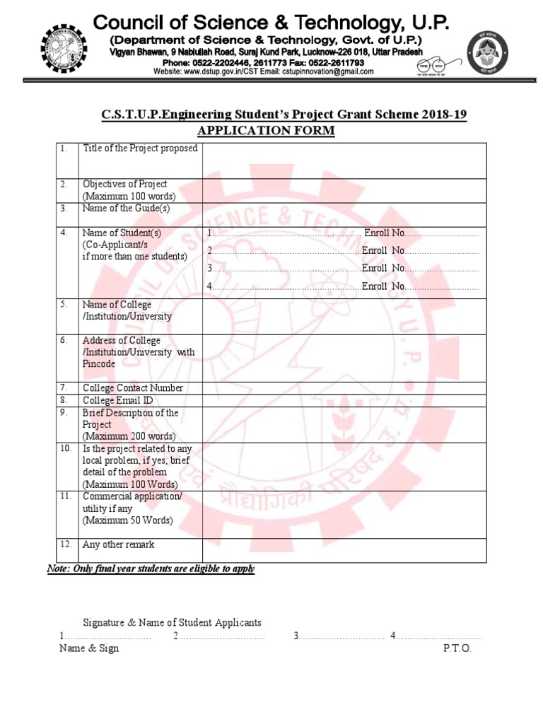 CST, UP for consideration under CST, UP Engineering Student’s Project Grant