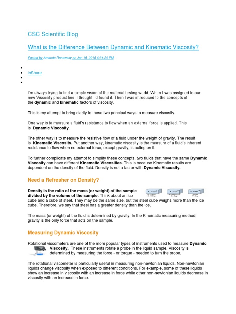 A basic difference between the dynamic and kinematic viscosity measurements is density. Taking