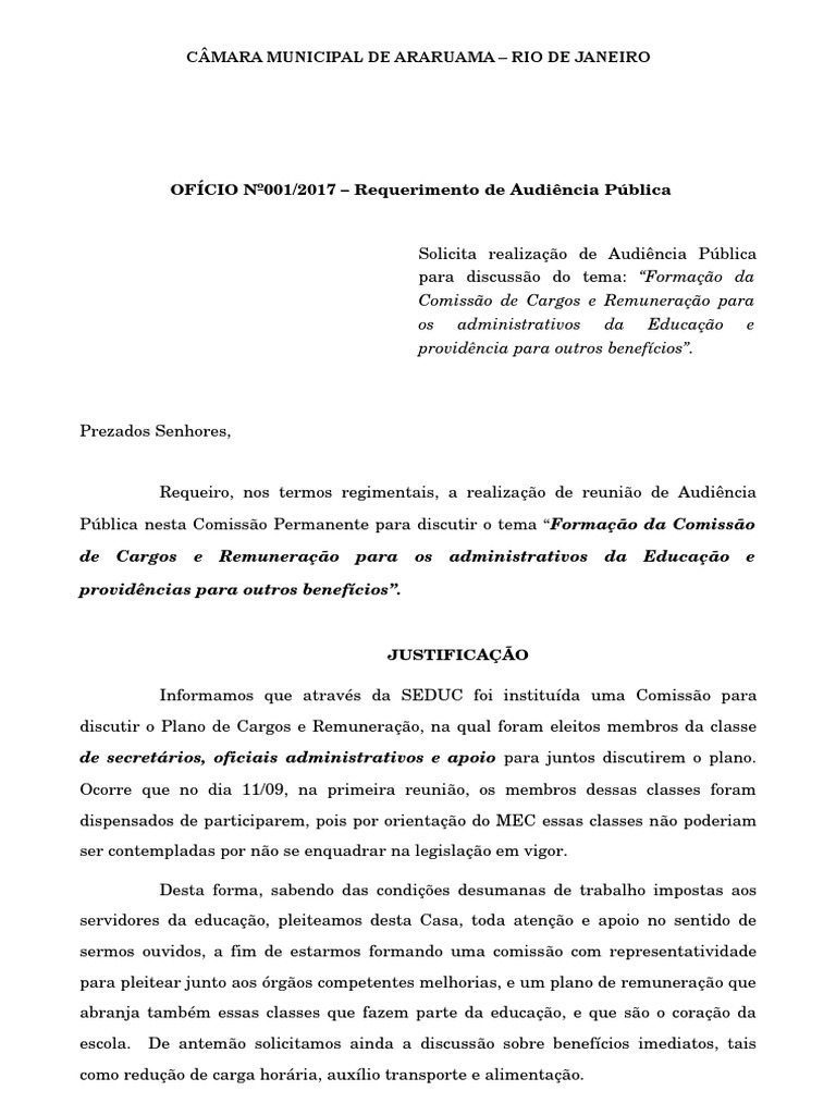 OFÍCIO Nº001/2017 – Requerimento de Audiência Pública