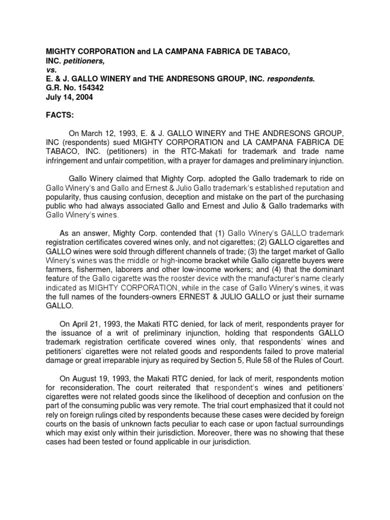 INC (respondents) sued MIGHTY CORPORATION and LA CAMPANA FABRICA DE
