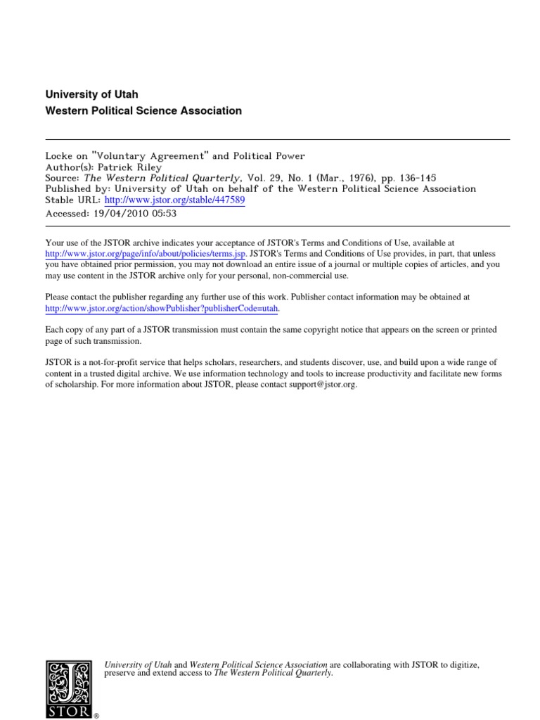 which is not simply voluntarist and contractarian." in Democratic Theory (Oxford 1973). MacPherson. 1953). in Political Writings. Two Treatises . 234: "Locke's doctrine of property. p."54 Cf. over what Locke's theory of property "does" to the rest of his political system. Natural Right and History (Chicago. it leads to reducing consent.. if one were trying to account for Locke's complete concept of right." This is not so much false as one-sided. political power to governors for the benefit of their subjects". is certainly its most characteristic part.at its best it allows one to place a reasonable construction on his claim that "voluntary agreement gives. particularly p. . MacPherson and Leo Strauss. Cf. or of reputation) which one under- stands. B.as it could have been had he recast the whole of Book II Chapter 21 of the Essay . 441. 40. pp.53 One need not think that dis- pute fruitless (as indeed it is not) in order to insist a little on examining the co- herence of the voluntarist strand of Locke's political thought.. March 1970.")52 While one might well wish that Locke's theory of will were clearer and more consistent. 1953). u"Cf. his theory of will does not exclude the possibility of determining oneself to action in accordance with the conception of a law (whether divine. though." American Political Science Review. Watkins. but which has nearly been lost sight of in disputes. as they willingly. (Edinburgh. Rousseau. pp... The Social Contract. ultimately. one would have to balance in some sort of equilibrium with natural law and natural rights. C.a strand which led to his claim that men are free of political obligation (though not of course of moral obligation) until they are put "under such a frame of government. civil. 228 ff. F.elements which. And that is all that is necessaryto make the voluntarist and contractarian elements of the Second Treatise relatively intelligible. p.. Leo Strauss. contract and natural rights in Locke to a marginal status. ed. (In Locke there is no General Will which is "always right. Locke on "VoluntaryAgreement"and Political Power 145 Apart from a few passages such as this. it leaves open the possibility of obligating oneself in a reasonable sense. initiated by C. "Natural Rights in Hobbes and Locke. which is almost literally the central part of his political teaching. B. 234 ff.a claim that is an essential part of his complete concept of right. the author's "A Possible Explanation of Rousseau's General Will. and of choice consent to.Laslett ed.