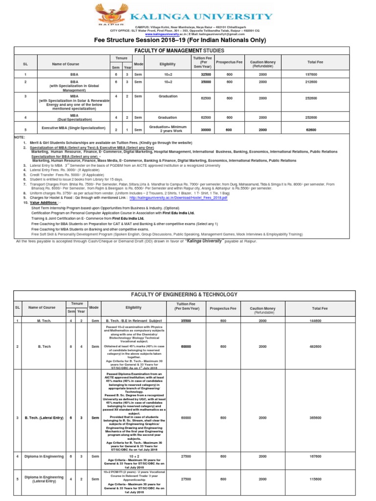 All the fees payable is accepted through Cash/Cheque or Demand Draft (DD) drawn in favor of “Kalinga University” payable at Raipur.