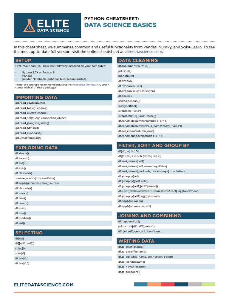 In this cheat sheet, we summarize common and useful functionality from Pandas, NumPy, and Scikit-Learn. To see