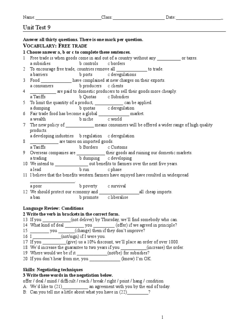 1 Free trade is when goods come in and out of a country without any __________ or taxes.