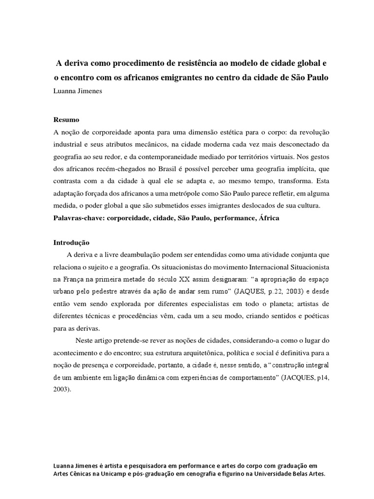 A Deriva Como Procedimento de Resistência Ao Modelo de Cidade Global e o Encontro Com Os Africanos Emigrantes No Centro Da Cidade de São Paulo