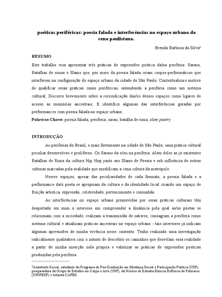 Palavras-Chave: poesia falada; periferia; sarau; batalha de rima; slam poetry.