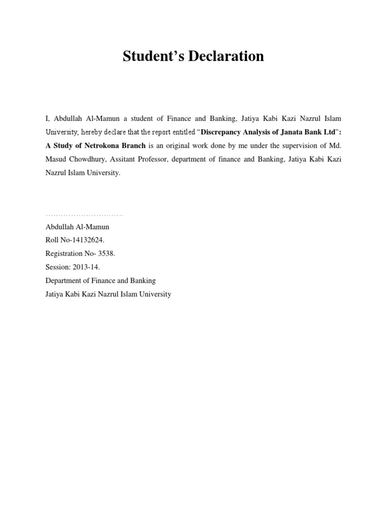 University, hereby declare that the report entitled “Discrepancy Analysis of Janata Bank Ltd”: