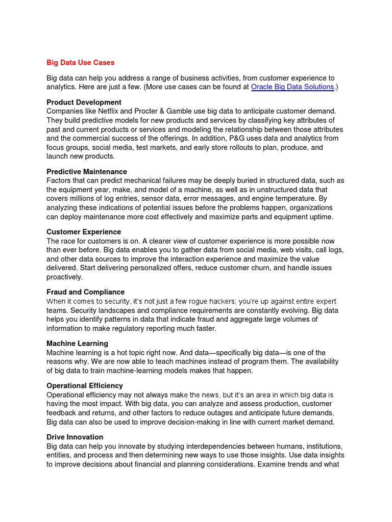 analytics. Here are just a few. (More use cases can be found at Oracle Big Data Solutions.)