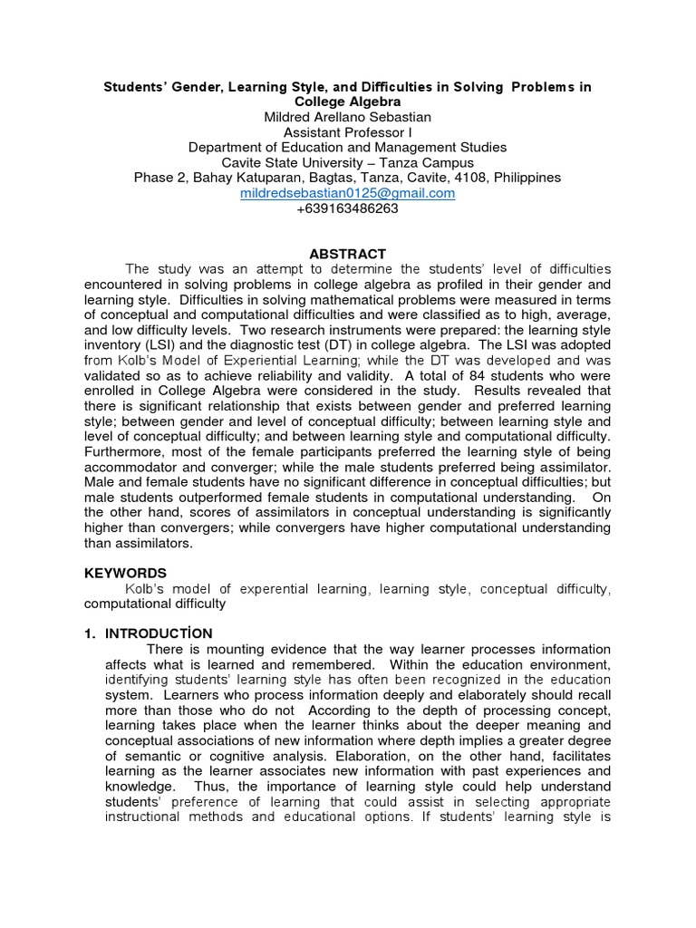 Students' Gender, Learning Style, and Difficulties in Solving Problems in College Algebra