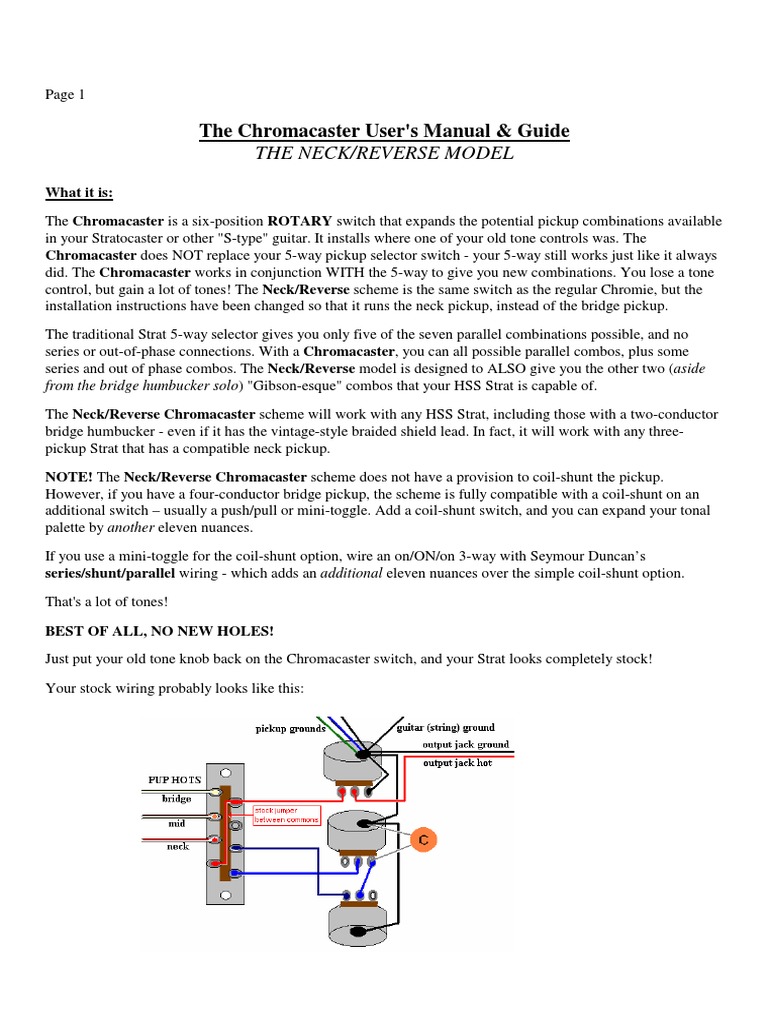 Basically, the Neck-Reverse Chromacaster re-routes the leads of the neck pickup to various places in the