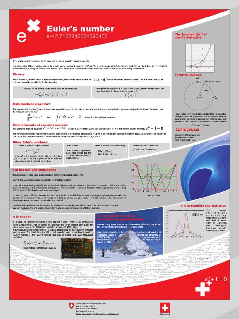 e is also the amount of money if you deposit 1 Swiss Frank at a continuously 0.5 daily in statistics,