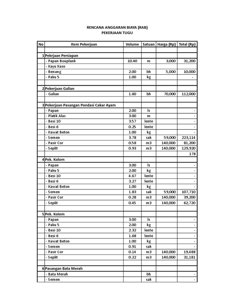 No Item Pekerjaan Volume Satuan Harga (Rp) Total (Rp)