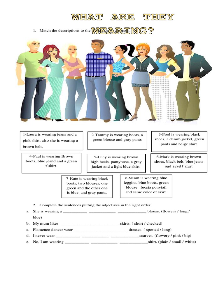 a. She is wearing a ___________ ____________ _____________ blouse. (flowery / long /