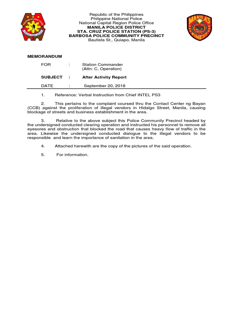 (CCB) against the proliferation of illegal vendors in Hidalgo Street, Manila, causing