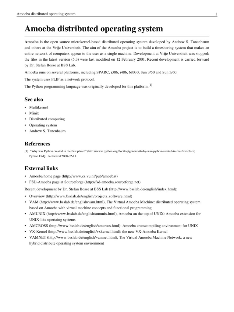 Amoeba distributed operating system Source: http://en.wikipedia.org/w/index.php?oldid=357405103 Contributors: Alex.g, Android Mouse, AutumnSnow, Bovineone, Brainix, Bryan