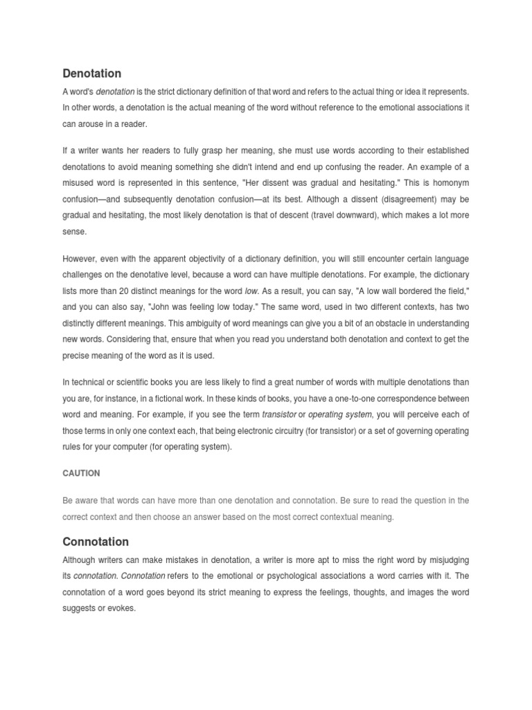 In other words, a denotation is the actual meaning of the word without reference to the emotional associations it