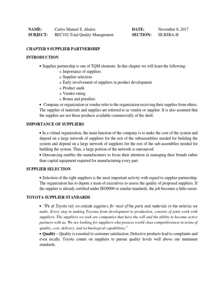 Supplier partnership is one of TQM elements. In this chapter we will learn the following: