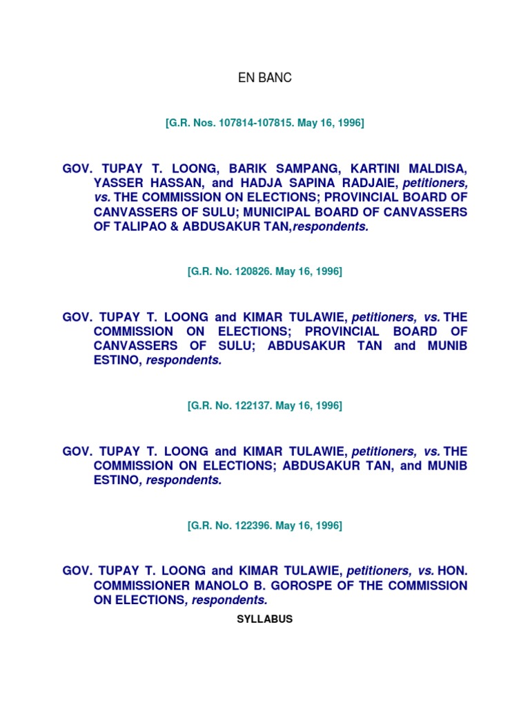 (4) G.R. No. 122396, entitled, "Gov. Tupay T. Loong and Kimar Tulawie vs. Hon.
