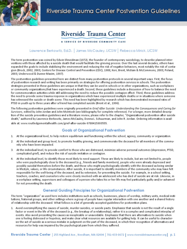 The following postvention guidelines were originally presented in Grief After Suicide: Understanding the Consequences and Caring for
