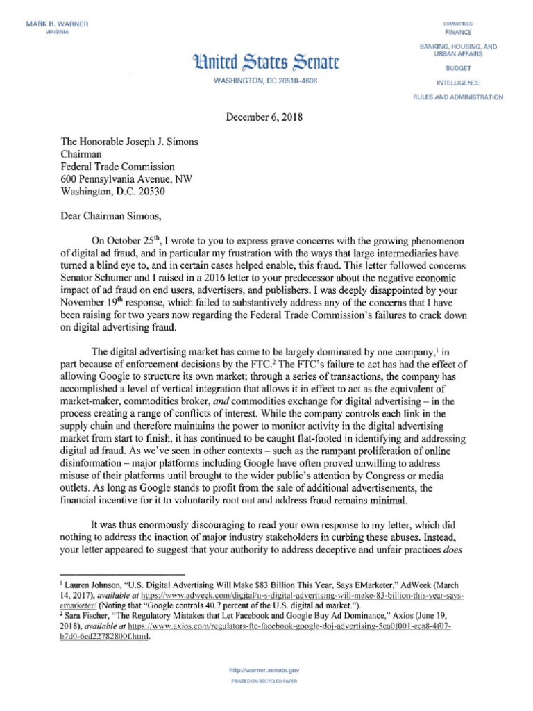 U.S. Sen. Mark R. Warner (D-VA) has sent another letter to Federal Trade Commission (FTC) Chairman Joseph J. Simons pressing the leader of the agency to use the authorities granted to it by Congress to protect American businesses and shoppers from digital advertising fraud, which reached $7.4 billion in 2016 – costs that are later passed on to consumers in the form of higher prices.