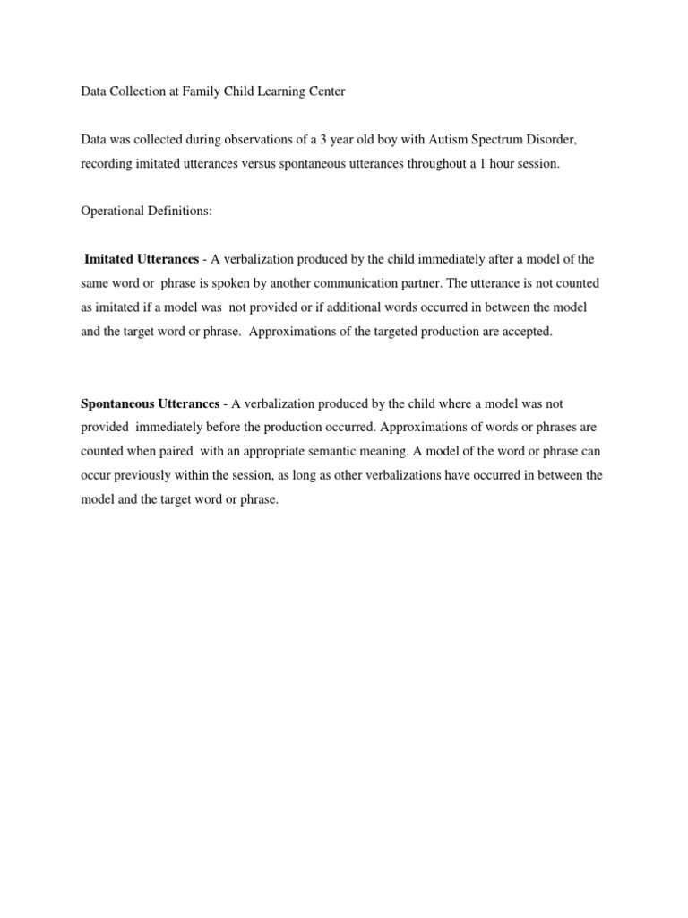 Spontaneous Utterances - A verbalization produced by the child where a model was not