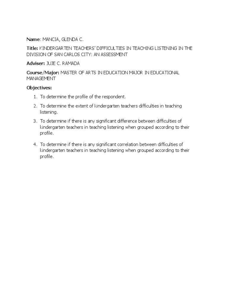 Title: KINDERGARTEN TEACHERS’ DIFFICULTIES IN TEACHING LISTENING IN THE