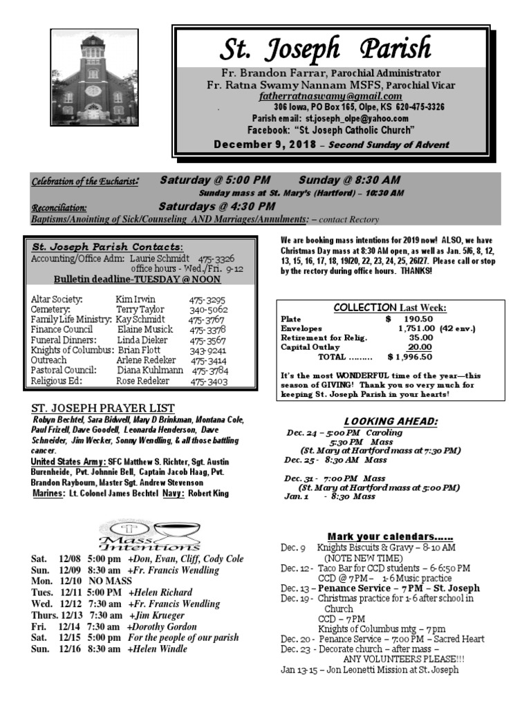 Tues. 12/11 5:00 PM +Helen Richard Dec. 13 – Penance Service – 7 PM – St. Joseph