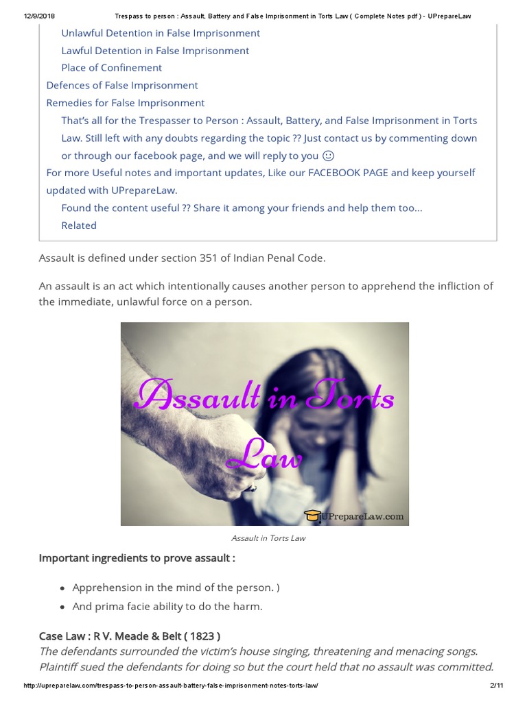 12/9/2018 Trespass to person : Assault, Battery and False Imprisonment in Torts Law ( Complete Notes pdf ) - UPrepareLaw