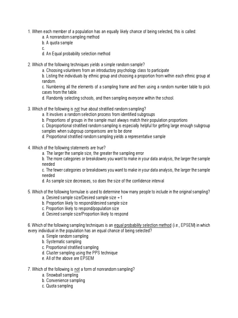 17. Which of the following is the most efficient random sampling technique discussed in your chapter?