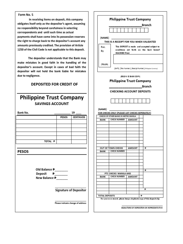depositor’s account. Except in cases of bad faith the (DATE) (Tele Number) (Receipt Number) (Philippine Currency)