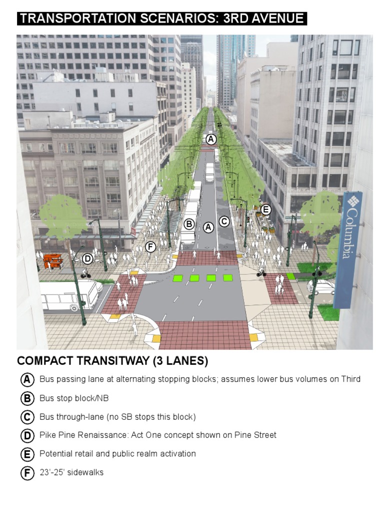 Bus passing lane at alternating stopping blocks; assumes lower bus volumes on ThirdBus stop block/NBBus through-lane (no SB stops this block)Pike Pine Renaissance: Act One concept shown on Pine StreetPotential retail and public realm activation23’-25’ sidewalks
