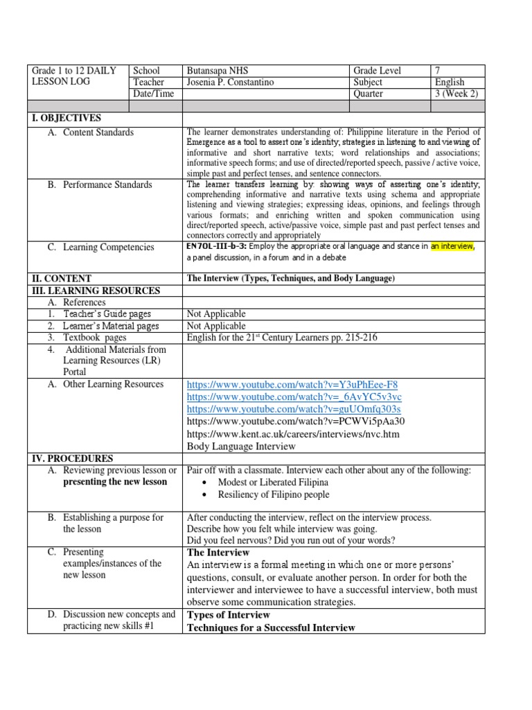 C. Learning Competencies EN7OL-III-b-3: Employ the appropriate oral language and stance in an interview,
