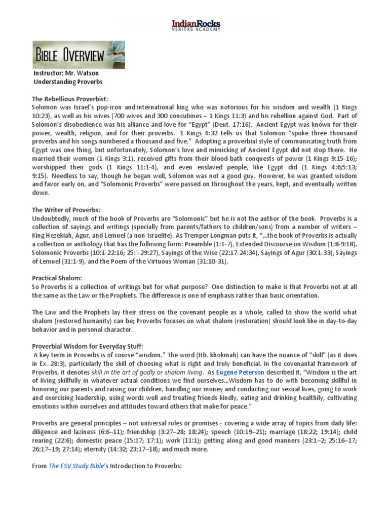 Proverbs are general principles – not universal rules or promises - covering a wide array of topics from daily life: